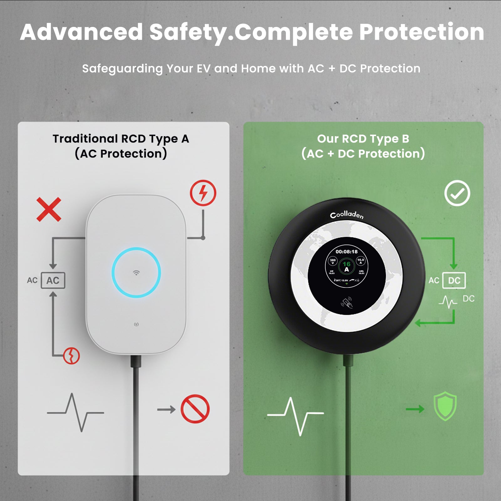 Veiligheid is de basis van de Coolladen-ervaring. Volledig CE en RoHS gecertificeerd, onze wallbox heeft een ingebouwde RCD Type B sensor (AC 30mA + DC 6mA).