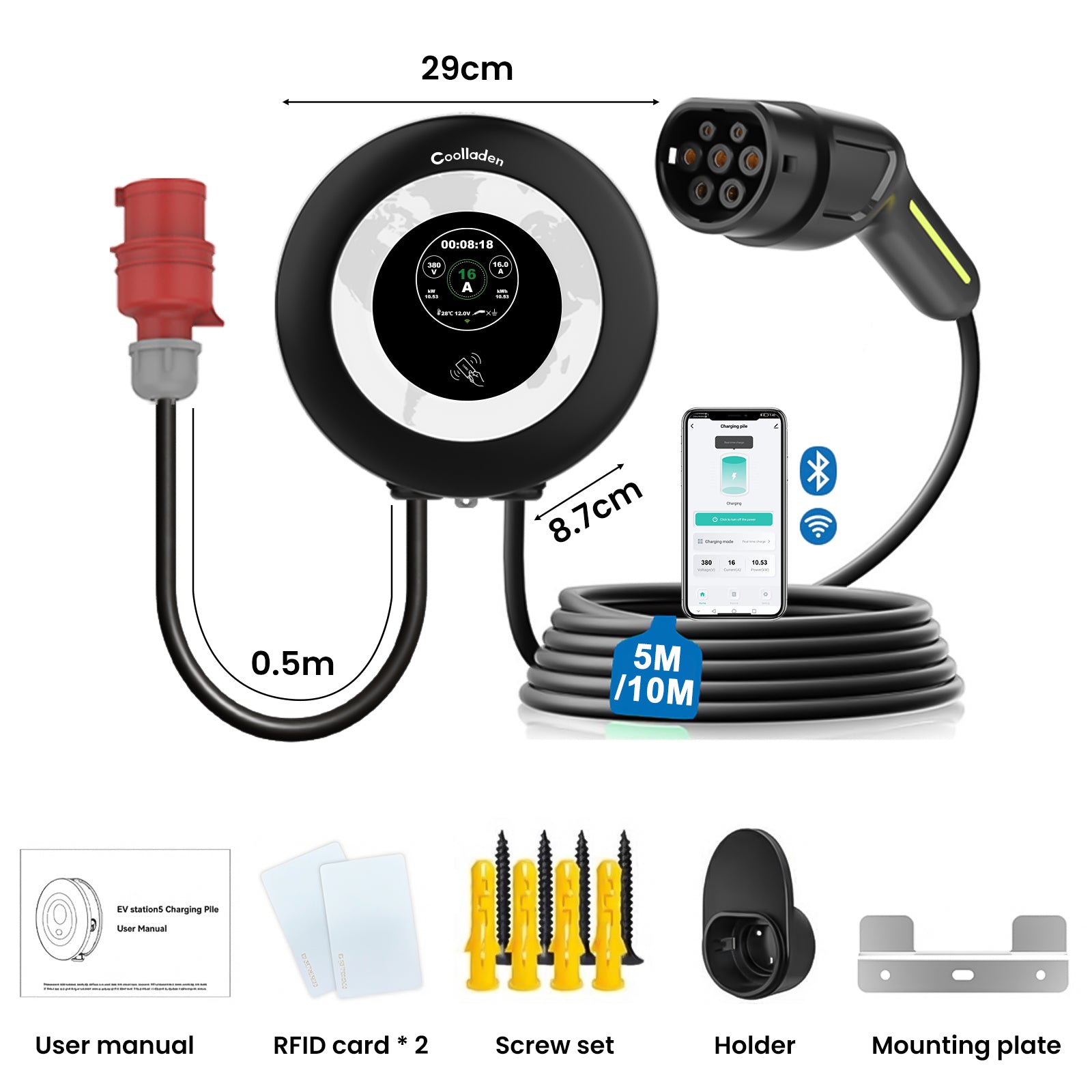 📦 Inbegrepen: 1x Wallbox, 2x RFID Beveiligingskaarten, Wandmontageset, Kabelhouder, Gebruikershandleiding.